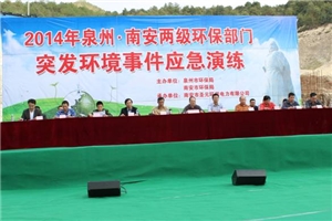 2014年11月20日 15:30 由泉州市環保局溫雙慶副局長宣布泉州·南安兩級環保部門突發環境應急演練開始。本次演練承辦方為南安市聖元環保電力有限公司。 本次演練是以南安廠氨水儲罐底部閥門損壞,導致氨水大量泄漏,造成現場工作環境惡化、氨等揮發性汙染氣體擴散、部分氨水進入廠區雨水管網為模擬背...