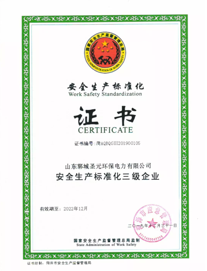 近日,山東菏澤市應急管理局授予鄆城聖元“安全生產標準化三級企業”榮譽稱號,這標誌著鄆城聖元安全生產管理邁向新的發展階段。