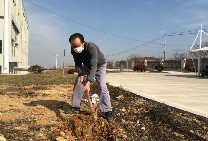 當日下午,人事行政部組織員工們來到公司生活區的荒地上。植樹活動現場熱火朝天,大家分工合作、配合默契,幹勁十足,除草、拉線、挖坑、扶苗、培土、夯土、澆水、踩實,每一道工序都一絲不苟。