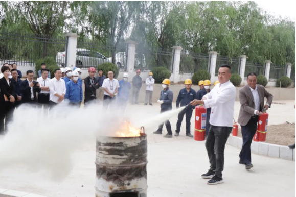 在汽機房前空地上,安環部示範講解了消防器械的正確使用方法及技巧,並組織員工輪流進行火災撲救模擬訓練。