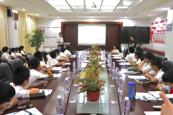在會議室,小記者們觀看宣傳片,楊煌坤副總以通俗易懂的語言介紹垃圾處理設施及垃圾焚燒發電工藝。