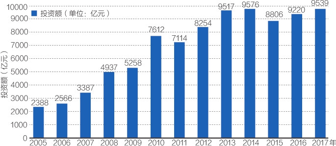 2005年至2017年,我國對環境汙染治理投資快速增長。2010年10月10日,國務院發布了《關於加快培育和發展戰略性新興產業的決定》,更是將環保產業作為戰略性新興產業之一加以培育和發展。2017年,全國環境汙染治理投資總額達到9538.95億元,是2005年的4倍,全國環境汙染治理投資總額保持較快的增長速度,複合增長率達到12.23%。