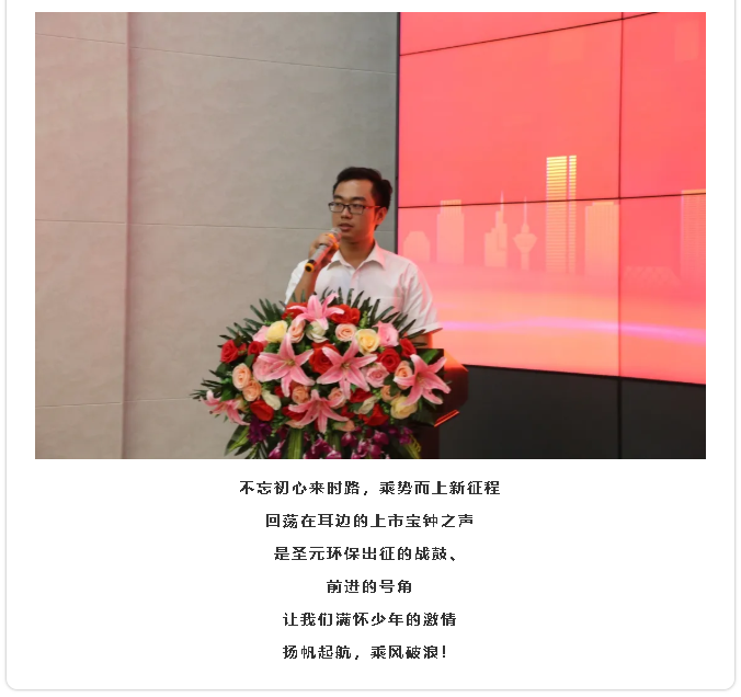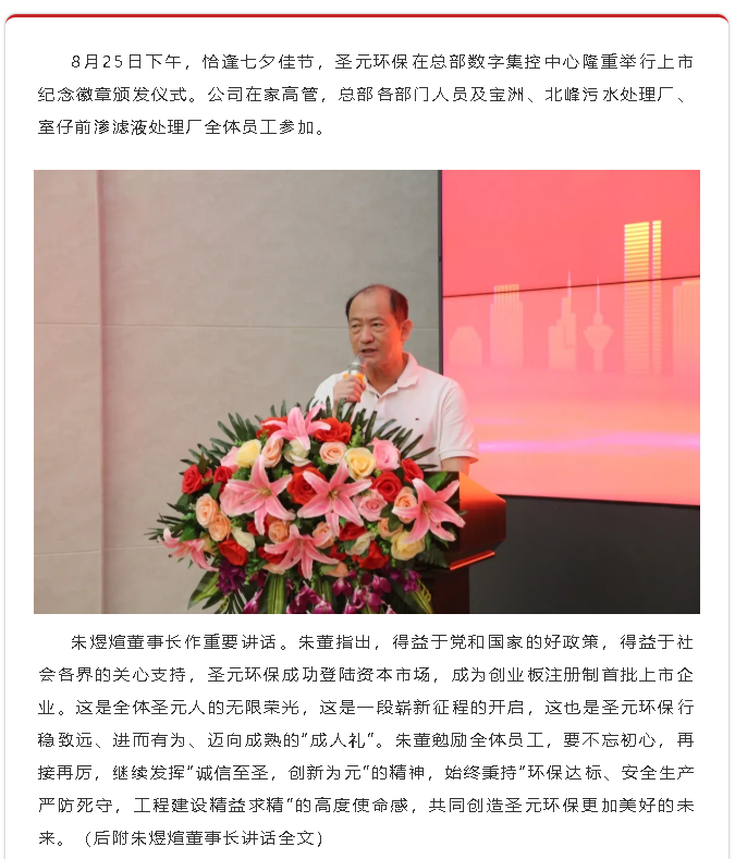 掛牌次日,聖元環保給員工頒發上市紀念徽章