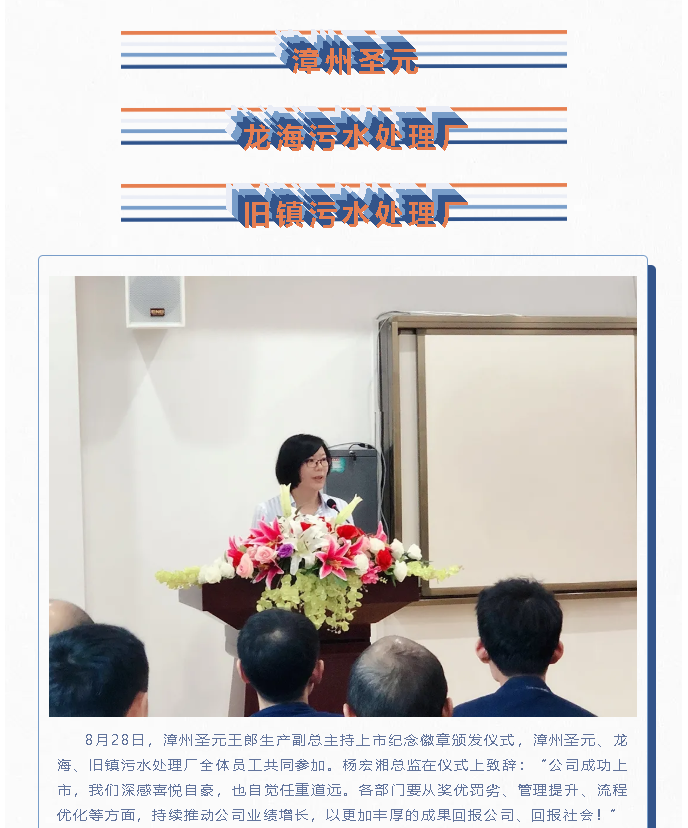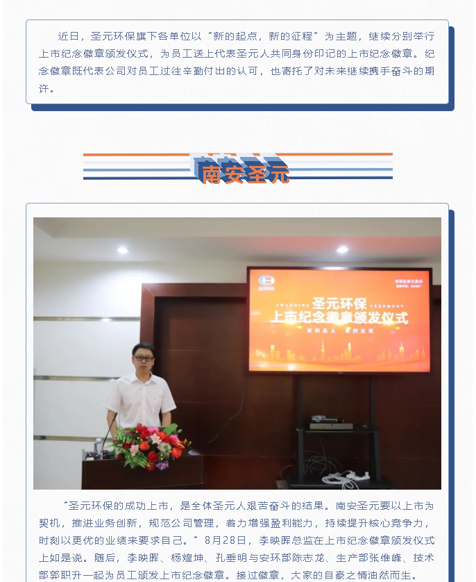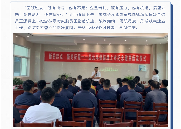 聖元環保旗下南安、漳州、鄆城、慶陽、汶上、鄄城、梁山、龍海、舊鎮廠給員工頒發上市紀念徽章
