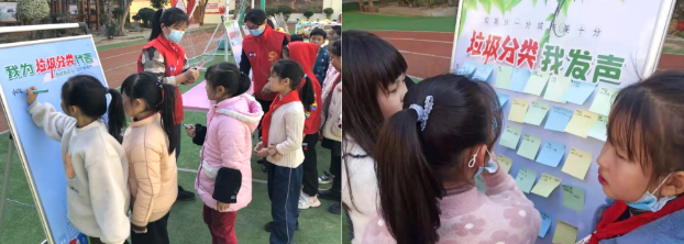 活動中,孩子們在誌願者的引導下,依次在“我為垃圾分類代言”板上簽名,並記錄下自己的垃圾分類“綠點子”,張貼到“垃圾分類我發聲”展板上。學生在生動活潑氛圍中讀懂垃圾分類等環保知識,樹立正確理念。