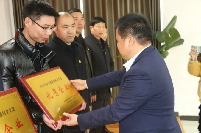 活動中,盱眙縣委常委、縣委組織部部長高進鋒為“2020年度黨建聯盟村企共建優秀企業”獲獎單位江蘇聖元頒獎。江蘇聖元運營總監林建武上台領獎。