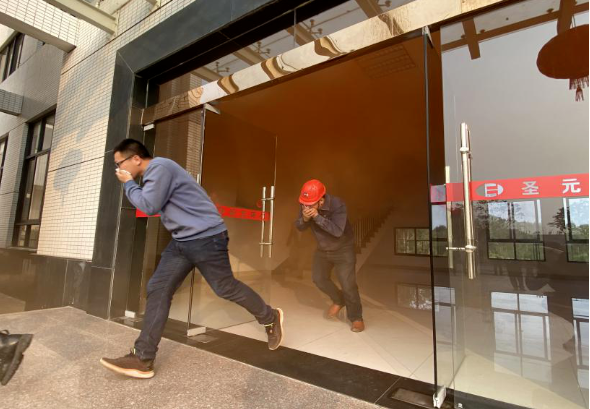 16點30分,用於演習的消防煙霧彈準備停當;16點40分,中控室通過公共廣播係統發出消防警報;聽到火災警報後,各部門員工迅速有序地通過指定疏散路線撒離到綜合樓前空地。疏散逃生過程,樓梯及安全出口處均未出現堵塞、推擠現象,整個過程比較順暢。