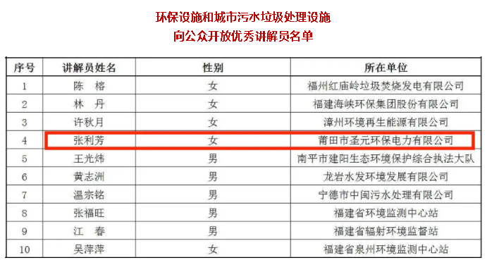 近日,福建省生態環境廳、福建省住房和城鄉建設廳公布環保設施和城市汙水垃圾處理設施向公眾開放優秀案例、優秀講解員入選名單 。“泉州市寶洲汙水處理廠向公眾開放”、“莆田聖元環保社區共享中心”被評為環保設施向公眾開放優秀案例,莆田聖元張利芳被評為環保設施向公眾開放優秀講解員。
