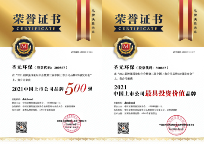 2022年1月26日,2021品牌強國論壇年會暨第三屆中國上市公司企業500強榜單在上海隆重發布。聖元環保攬獲“2021中國上市公司品牌500強”和“2021中國上市公司最具投資價值品牌”雙項大獎。