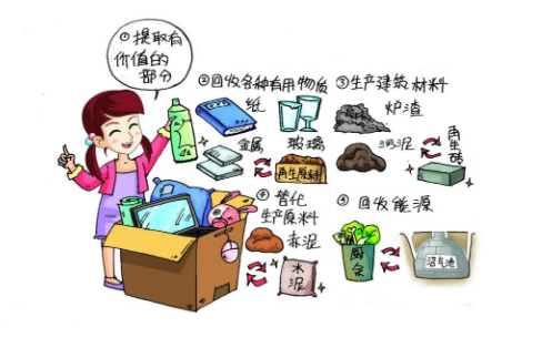 ②回收各種有用物質。例如,紙張、玻璃、金屬、塑料等固體廢物的再生利用。