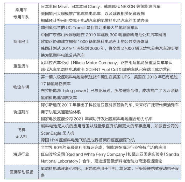 guojiqingnengzhengcejiweilaiyuanjingshirangqingnengxiezhugaishanquanqiunengyuanxitong,yingduiqihoubianhua,baozhangshijiejingjidekechixufazhan,guojiqingnengzhengceheyingyongzaiweilairenghuiyanxujiyouqushi,jixujiaqiangzhiqing、儲氫輸運、氫加注、氫能終端利用等環節的研究與發展。世界各國的氫能研究者和參與者也在不斷加強氫能技術研究交流、廣guang泛fan實shi施shi氫qing能neng應ying用yong的de開kai發fa示shi範fan項xiang目mu,並bing嚐chang試shi進jin行xing氫qing能neng應ying用yong場chang景jing的de構gou建jian,雖sui然ran氫qing能neng應ying用yong場chang景jing目mu前qian尚shang處chu在zai早zao期qi,但dan已yi大da致zhi可ke分fen為wei乘cheng用yong車che專zhuan用yong車che隊dui、商用巴士、重型貨車、物流車輛、軌道列車、飛機(無人機)、海運行業、便攜移動設備等幾大類。
