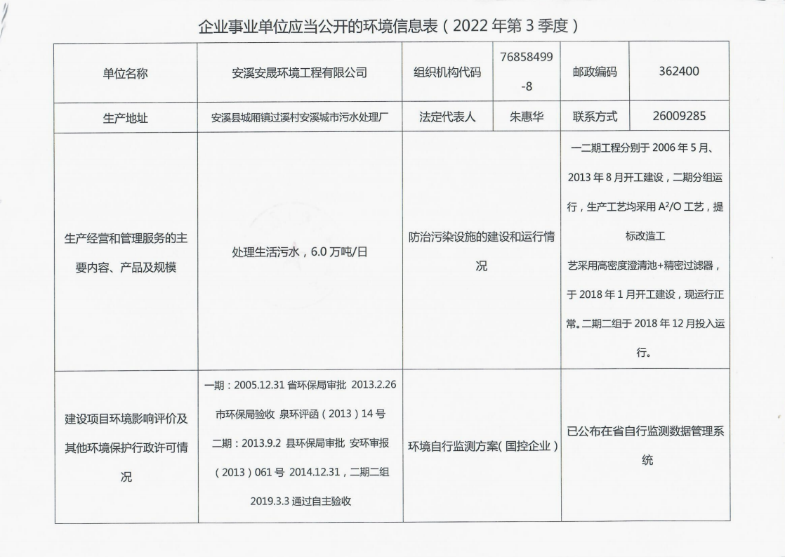 安溪城市汙水處理廠2022年第3季度環境信息公開