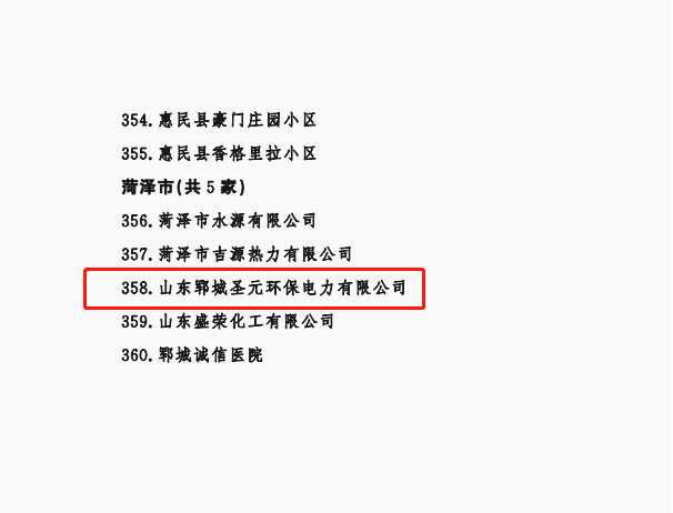 12月28日,山東省住房和城鄉建設廳、山東省發展和改革委員會、山東省工業和信息化廳、山東省水利廳聯合發布《關於公布2022年山東省節水型企業(單位)、社區(居住小區)評價結果的通知》,鄆城聖元獲評2022年省級節水型企業(單位)。