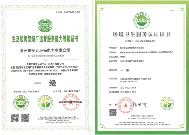 近日,泉州市聖元環保電力有限公司(以下簡稱“泉州聖元”)獲得中城環認證中心頒發的生活垃圾焚燒廠運營服務能力認證證書(服務等級:一級),中國城市環境衛生協會對該認證結果予以認定。此舉表明泉州聖元在服務管理、服務特性、服務能力等方麵均為垃圾焚燒電廠中的佼佼者。