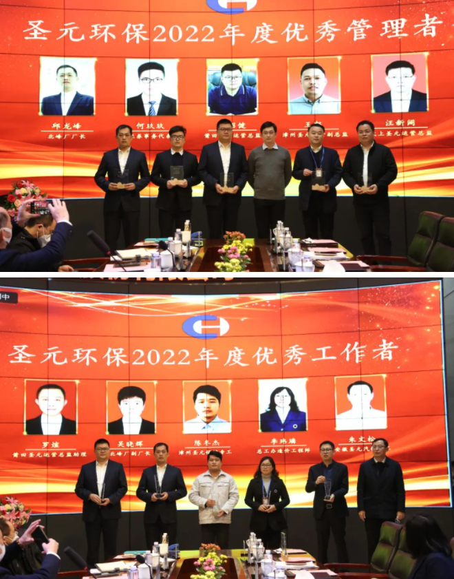 會議還對聖元環保2022年度優秀管理者、優秀工作者進行表彰,弘揚先進、樹立典範。其中邱龍峰、何玖玖、孔昭健、王郎、汪新闊榮膺“優秀管理者”;羅煊、吳曉輝、陳冬傑、李瑋璘、朱文鬆獲評“優秀工作者”。