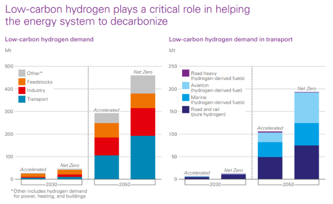 報告預測,到2030年,在加速轉型和淨零情境下,低碳氫需求量將分別達到3000萬噸/年、5000萬噸/年,其中大部分低碳氫主要作為能源和工業還原劑等用於替代天然氣、煤基氫(用作精煉、生產氨和甲醇的工業原料)及煤炭等;其餘低碳氫將用於化學品及水泥生產等。