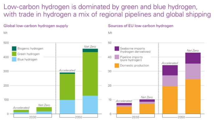 以歐盟為例,報告預測,在加速轉型和淨零情境下,到2030年歐盟生產的低碳氫約占總量的70%,到2050年將降低至60%;在進口的低碳氫中,約50%純氫通過管道從北非及其它歐洲國家(如挪威、英國)進口,另外50%將以氫衍生物方式從全球市場通過海運方式進口。