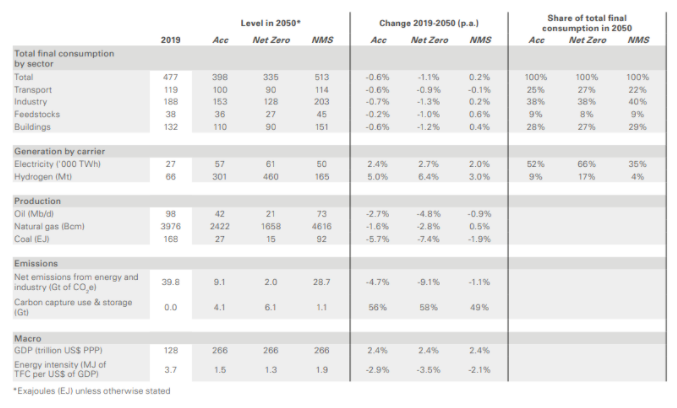 報告假設了加速轉型、淨零和新動力三種情景下到2050年能源係統的演變趨勢。報告提出,在加速轉型情景下,碳排放將減少約75%;在淨零情景下,碳排放將減少超過95;新動力情景(假設過去5年世界能源發展總體情況包括技術進步、成本下降等以及全球各國政策力度在未來5-30年不變)下,全球碳排放將在21世紀20年代達峰,到2050年全球碳排放相較2019年降低30%左右。