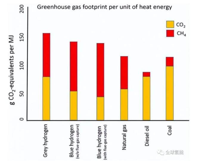 該研究稱,假設天然氣甲烷逃逸率為3.5%,可在大氣中留存約20年,則藍氫的總二氧化碳排放當量比灰氫少9%-12%。但由於碳捕獲和封存需要使用天然氣作為動力能源,藍氫的逃逸性甲烷排放量高於灰氫;且藍氫全生命周期溫室氣體排放比燃燒天然氣或煤炭取暖的排放還高約20%。即使將天然氣甲烷逃逸率降低到1.54%,藍氫的溫室氣體排放仍高於單純燃燒天然氣,僅比灰氫少18%-25%。