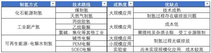 上遊:製氫的技術路線多元化,不存在單一最優模式;基於碳排放和可持續發展考慮,電解水製氫有望成為未來氫氣製取主流方式。