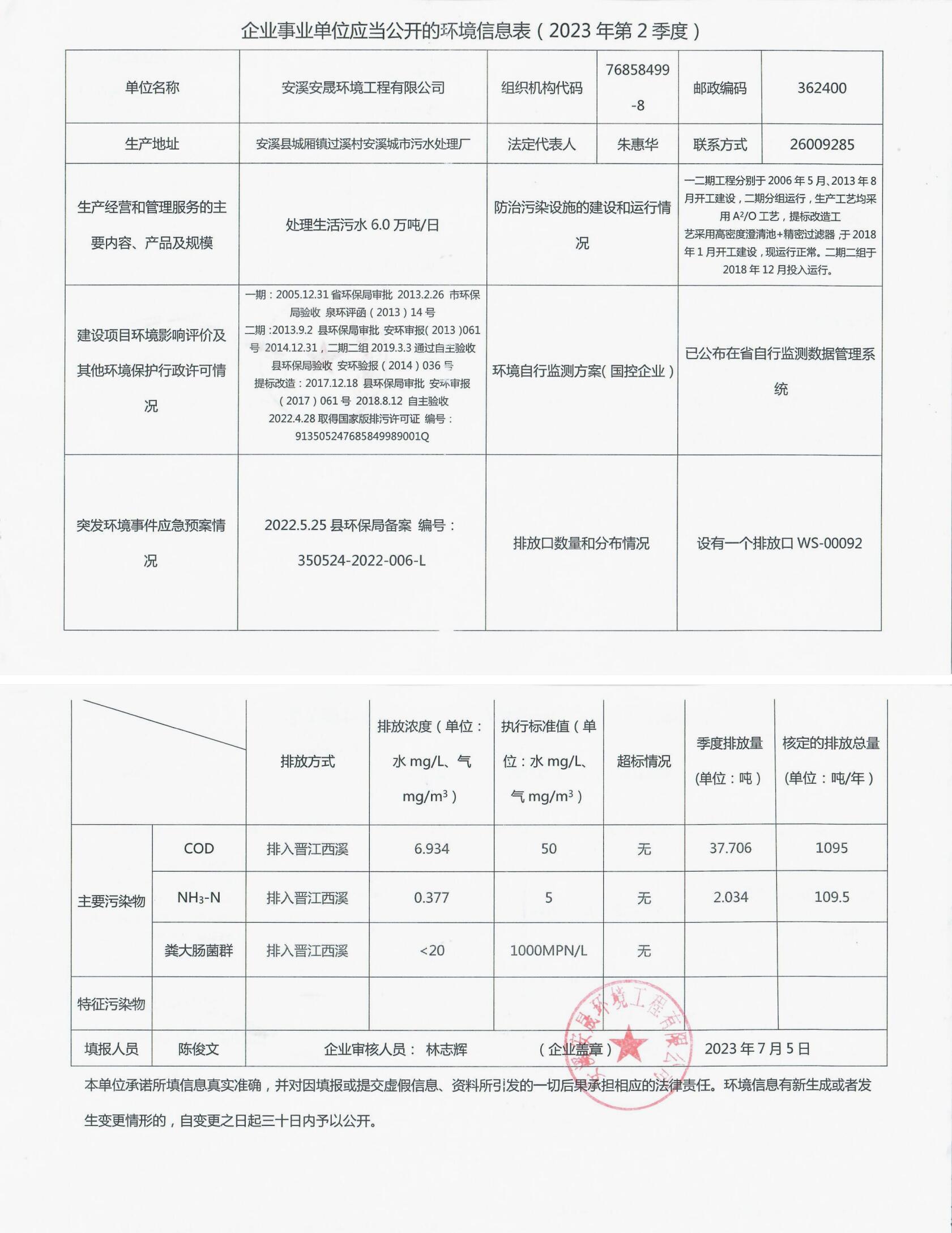 安溪城市汙水處理廠2023年第2季度環境信息公開
