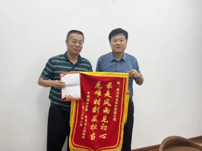 9月6日,南安市城管局局長侯小泉代表南安市委、市政府為南安聖元送上一封感謝信和一麵錦旗,對在南安市受“杜蘇芮”台風影響導致連續強降雨期間,聖元環保勇於擔當、積極響應並投入人力物力參與搶險救災的行動表示感謝。