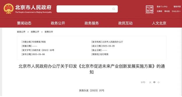 9月8日,北京市人民政府辦公廳關於印發《北京市促進未來產業創新發展實施方案》的通知,下稱《方案》。