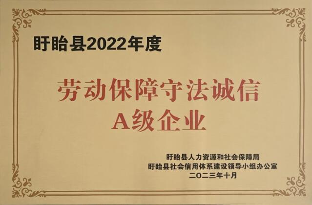 10月30日,江蘇聖元榮獲由盱眙縣人力資源和社會保障局、盱眙縣社會信用體係建設領導小組辦公室頒發的盱眙縣2022年度勞動保障守法誠信A級企業榮譽稱號。