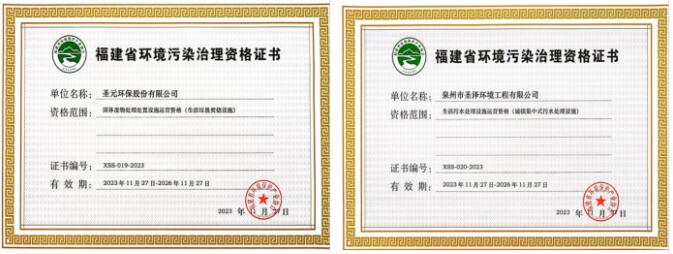 經審核,聖元環保股份有限公司和泉州市聖澤環境工程有限公司的申報材料符合要求,運營管理規範,同意頒發《福建省環境汙染治理設施運營資格證書》。