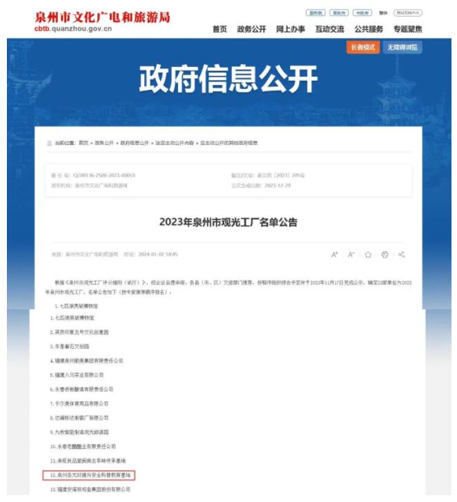 近日,泉州市文化廣電和旅遊局公布了2023年泉州市觀光工廠名單,其中泉州聖元環境與安全科普教育基地成功上榜。
