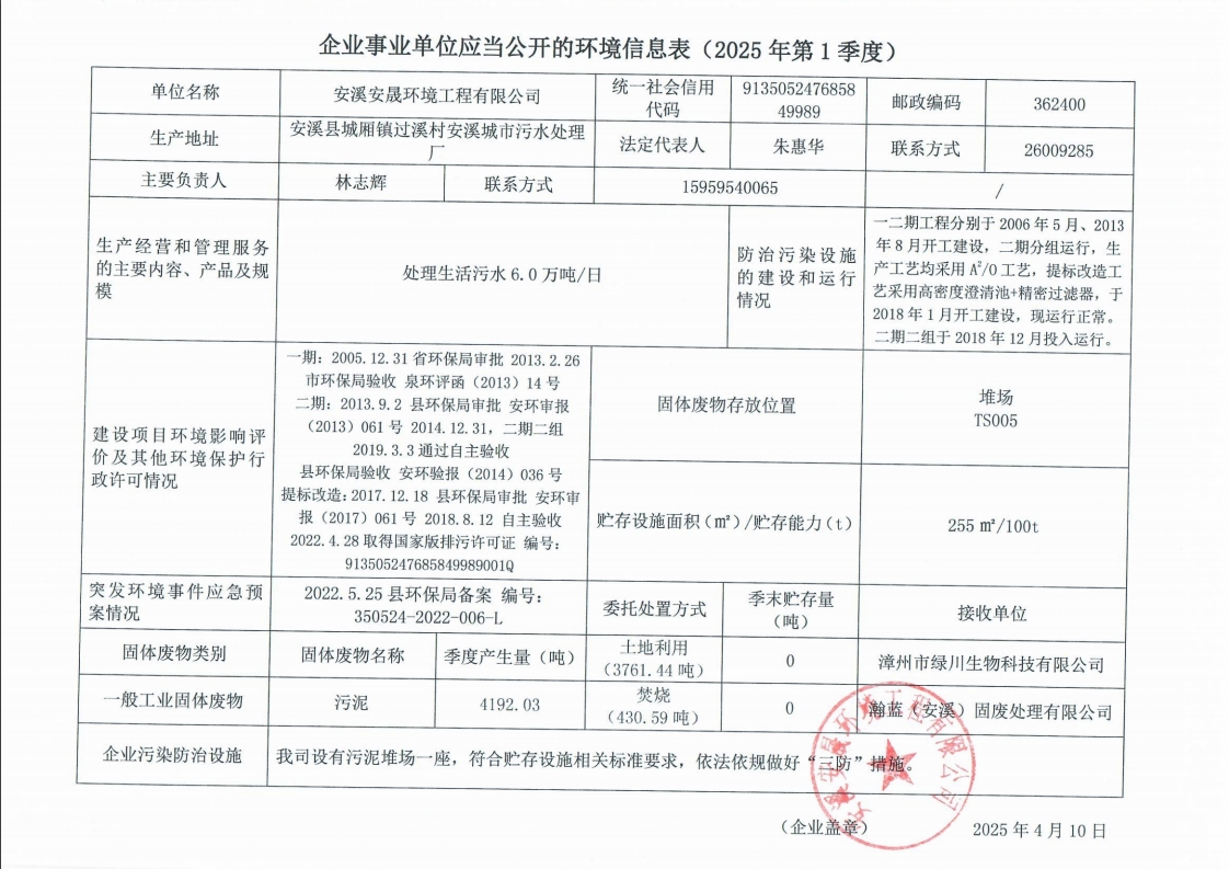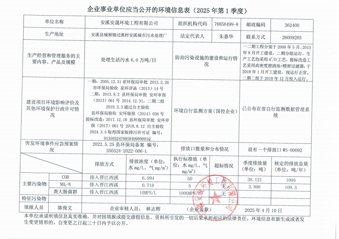 安溪城市汙水處理廠2025年第1季度環境信息公開