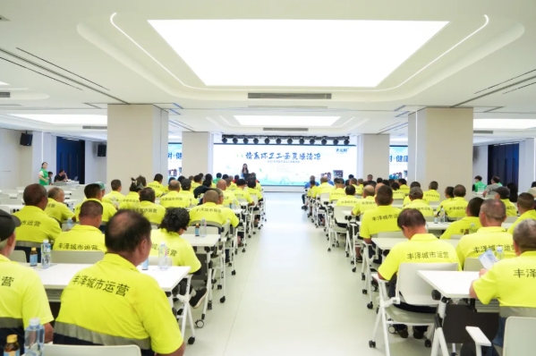 活動現場,80名環衛工人代表分批上台,從政企領導手中接過飽含心意的“聖元樹清涼能量包”。禮包內含牛磺酸能量飲、冰感降溫巾、戶外冰袖、香皂及可循環禮袋,實用物資為環衛工人高溫作業提供保障。未能到場的工人,禮包將由豐澤城運公司精準派送至一線。