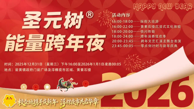 2025年12月31日,歲末狂歡夜,聖元樹®將攜手前黃鎮人民政府,在熱鬧的浮粿夜市共同打造“聖元樹®能量跨年夜”主題盛會!這不僅是一場跨年慶典,更是一次為健康與活力充電的能量之旅。