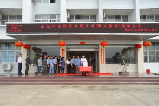 2013年4月26日上午10時,聖元環保股份有限公司全體員工在公司辦公樓前舉行了聖元環保股份有限公司“雅安地震”捐贈儀式,向地震災區人民獻愛心。朱煜煊董事長和公司領導陳文鈺、林文峰、朱恒冰、曾順生等出席活動。