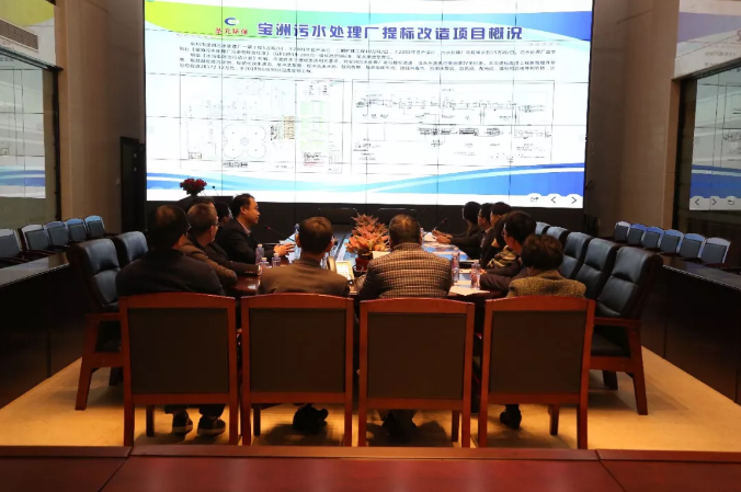 專家組首先來到視頻會議中心聽取了寶洲廠邱龍峰廠長介紹項目的總體概況、處理效果、運行情況、提標改造工程期間各重要時間節點及其施工中所遇到的難題。