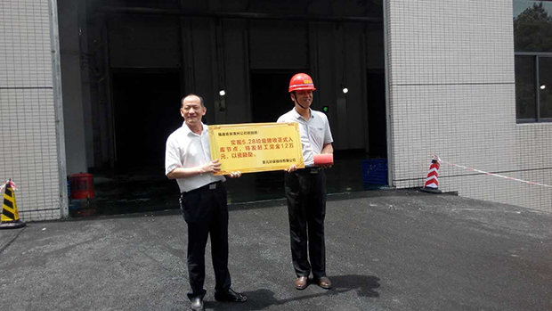 此外,為表彰福建省工業設備安裝有限公司漳州分公司項目部為實現5.28垃圾正式入庫節點所做的努力和貢獻,我司特向其發放獎金12萬元,以資鼓勵。聖元集團董事長朱煜煊為其頒獎。