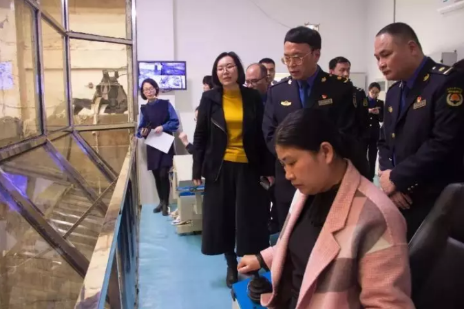 楊宏湘總監引導吳局長一行來到垃圾吊操作室,近距離觀察垃圾儲坑情況,了解垃圾焚燒前儲存發酵流程。