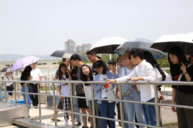 學生們在數字集控中心觀看企業宣傳片、聽取公司概況、業務範圍、技術資質等介紹後,第一站在寶洲汙水處理廠邱龍峰廠長的帶領下,依次參觀了粗細格柵、生化池、二沉池、反硝化衝洗車間等,詳細了解汙水處理主要構築物及設備的作用、汙染物質的去除過程、各項出水指標的控製情況,全麵了解A/O汙水處理工藝流程及特點。