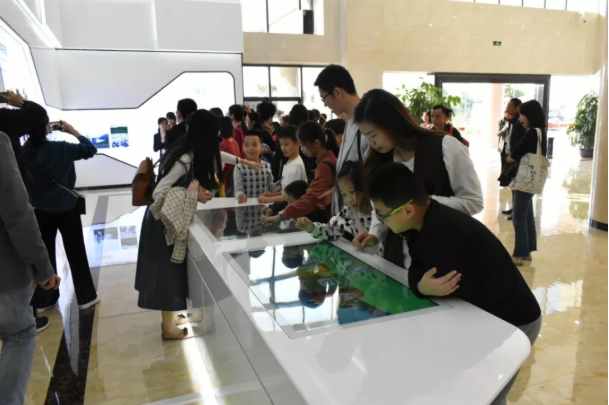 學生家長在一樓環保展廳體驗環保互動遊戲