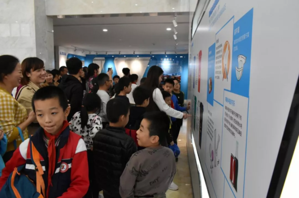 同學們在一樓環保展廳了解垃圾分類標簽