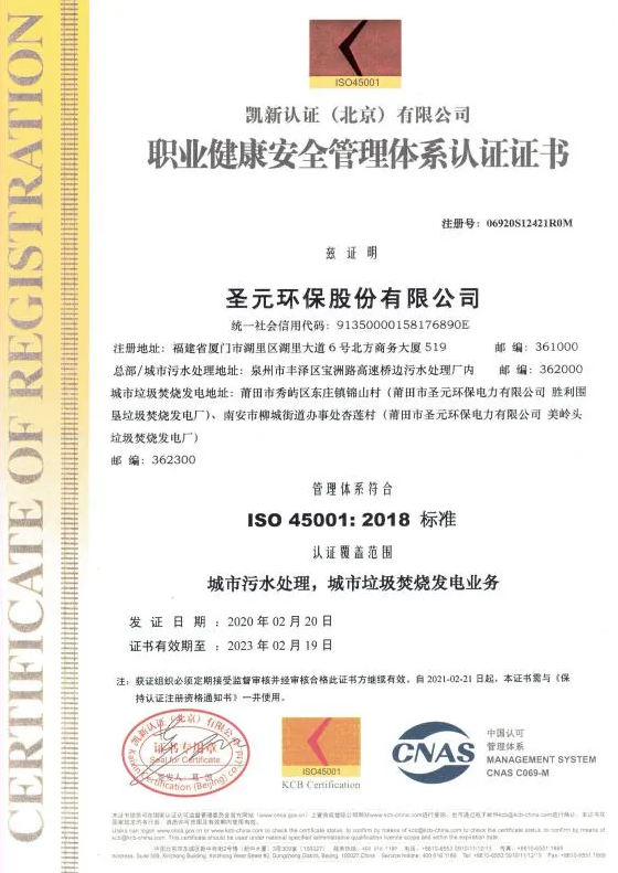 日前,聖元環保成功通過中國認可管理體係中心(CNAS)的ISO45001職業健康安全管理體係認證。至此,公司三體係認證(質量管理體係、環境管理體係、職業健康安全管理體係)全麵完成。