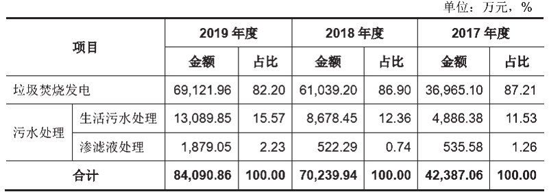 2017年、2018年和2019年,聖元環保垃圾處理費收入分別為1.21億元、1.79億元和2.16億元;售電收入分別為2.49億元、4.32億元和4.76億元;汙水處理收入分別為0.54億元、0.92億元和1.50億元。