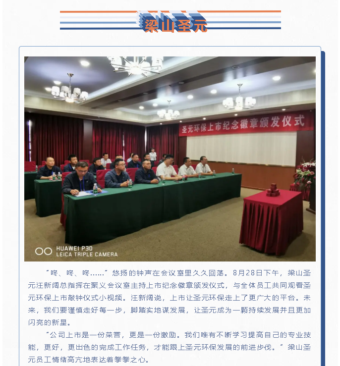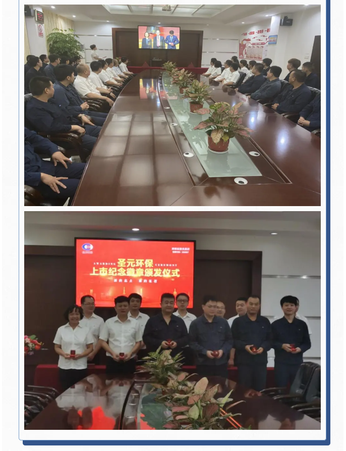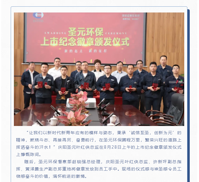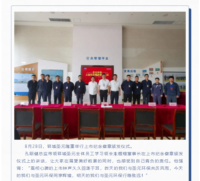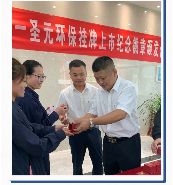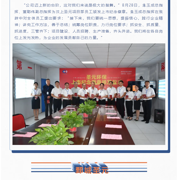聖元環保旗下南安、漳州、鄆城、慶陽、汶上、鄄城、梁山、龍海、舊鎮廠給員工頒發上市紀念徽章