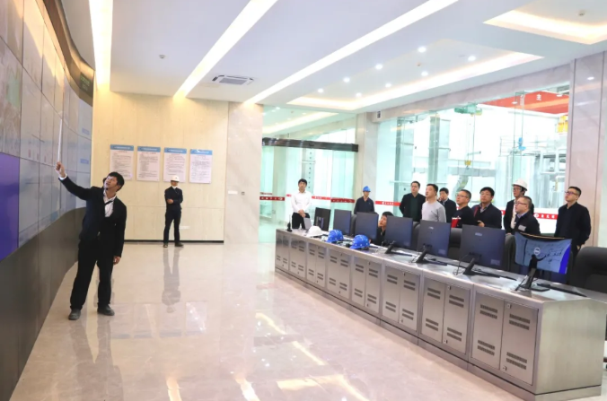 考察組實地走訪了餐廚項目生產現場、卸料大廳、環保宣導展廳等區域。在中控室,高永斌副局長通過中控大屏操作係統詳細了解餐廚項目設計規劃、工藝流程、餐廚垃圾收運係統及先進的自動化控製係統,詢問了當地有關政策、各專業設備供應商和工程建設等情況,對項目采用先進工藝、技術及高水平、高質量的建設標準大加讚賞。