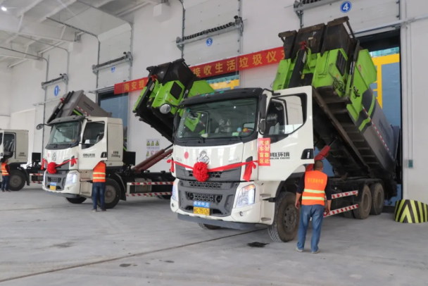 15時30分三輛垃圾運輸車依次緩緩駛入垃圾接收大廳。