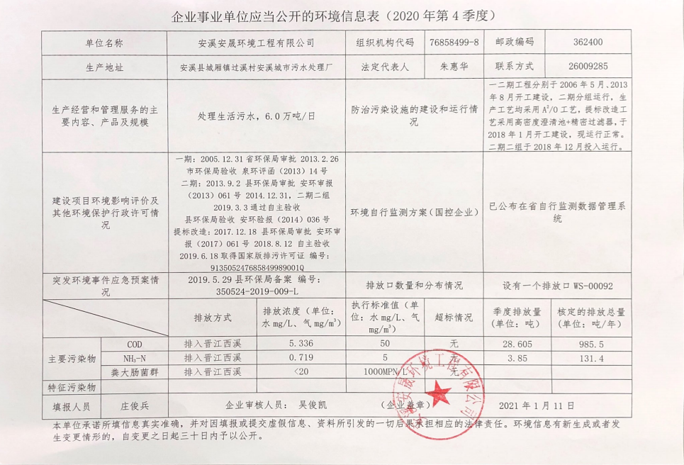 安溪廠2020年第四季度 企事業單位應當公開的環境信息表