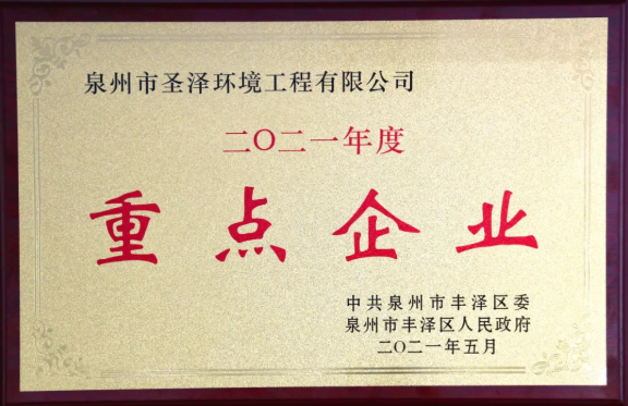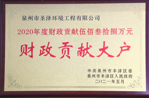 近日,聖元環保旗下泉州市聖澤環境工程有限公司被中共泉州市豐澤區委、區政府授予2020年“財政貢獻大戶”、2021年“重點企業”稱號。