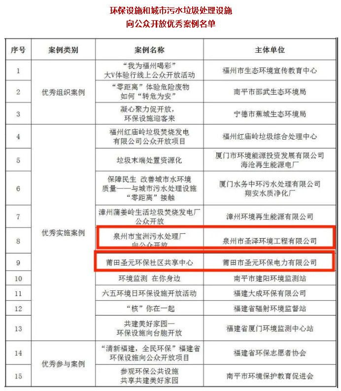 近日,福建省生態環境廳、福建省住房和城鄉建設廳公布環保設施和城市汙水垃圾處理設施向公眾開放優秀案例、優秀講解員入選名單 。“泉州市寶洲汙水處理廠向公眾開放”、“莆田聖元環保社區共享中心”被評為環保設施向公眾開放優秀案例,莆田聖元張利芳被評為環保設施向公眾開放優秀講解員。