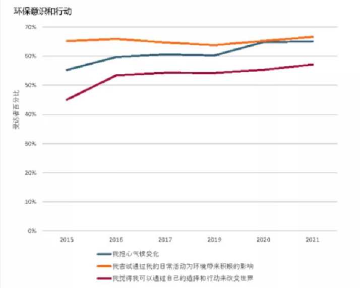 根據報告顯示,2021年,約65%的全球消費者擔心“氣候變化”問wen題ti,消xiao費fei者zhe逐zhu漸jian意yi識shi到dao個ge人ren行xing動dong對dui於yu氣qi候hou變bian化hua的de影ying響xiang,以yi及ji氣qi候hou變bian化hua對dui日ri常chang生sheng活huo的de影ying響xiang,生sheng態tai焦jiao慮lv促cu使shi消xiao費fei者zhe們men開kai始shi更geng加jia關guan注zhu環huan保bao行xing動dong和he購gou買mai決jue策ce。