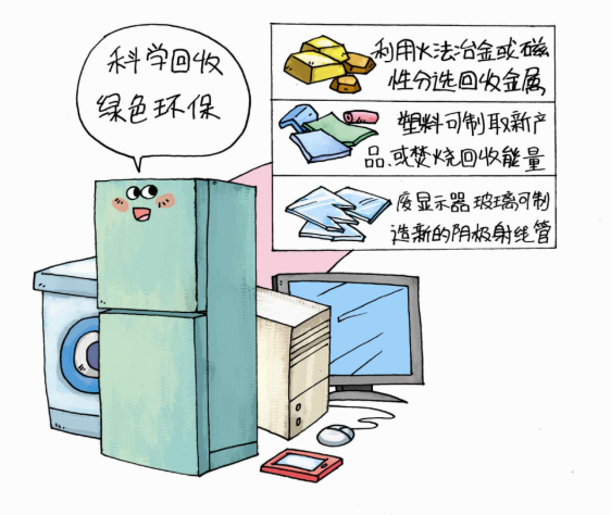 ③玻璃回收,例如利用廢顯示器玻璃製造新的陰極射線管,或者將電子產品中的玻璃用於其他生產。